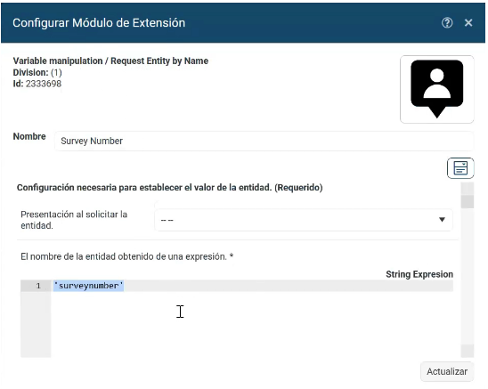 Para crear el Request Entity por nombre, se debe utilizar la etiqueta "nombre de la entidad obtenido de una expresión" y asignar la entidad previamente creada de tipo "Survey Number".