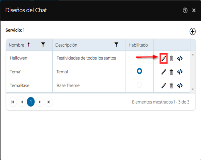Aquí se pueden crear varios temas y se seleccionará eñl tema por default con el cual el widget se presentará de cara a la página web del cliente.