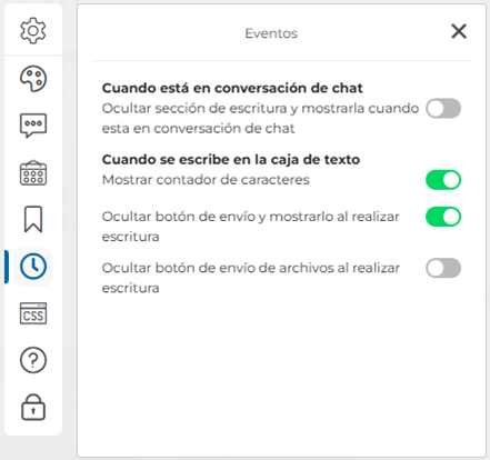 Mostrar contador de caracteres: Este campo, cuando está seleccionado, permite visualizar la cantidad de caracteres ingresados. Para indicar el límite correspondiente, este debe configurarse en el parámetro Máxima longitud del mensaje, ubicado en la sección de la caja de envío de texto dentro del chat.